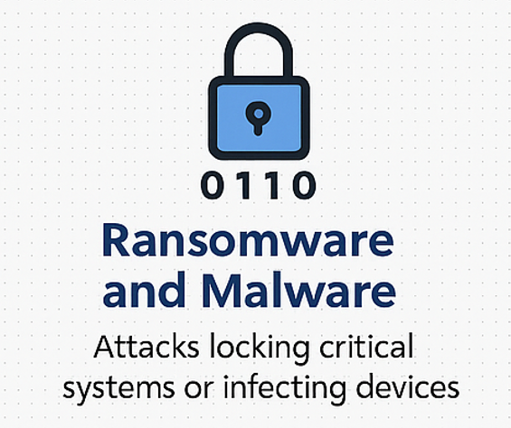 Ransomware attacks can lock critical systems, demanding a ransom for access. Malware can infect devices to disrupt operations or steal data.